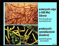 Modern cyanobacterium (below); eukaryotic (vaucherian) alga from the